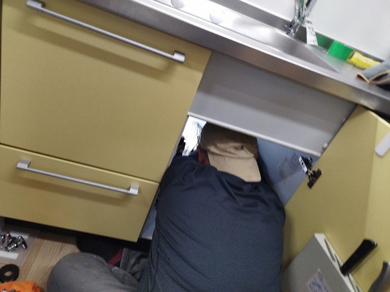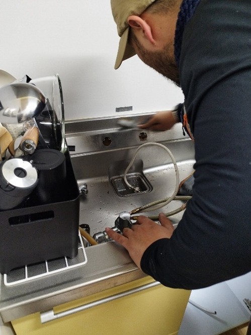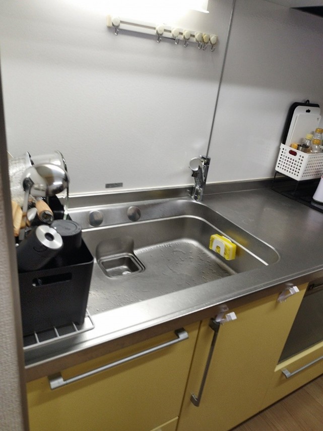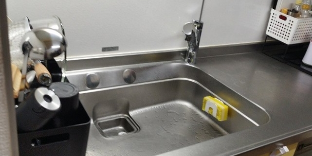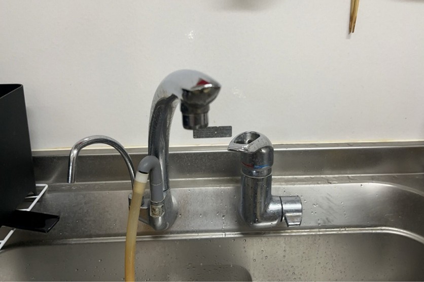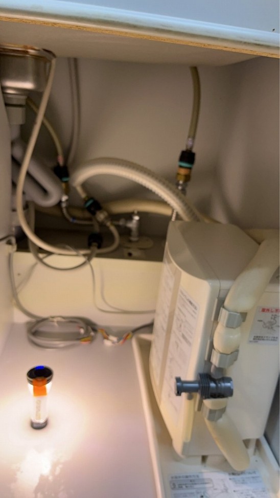 まずはキッチンの中のアルカリイオン水生成器との接続を切り離して既存の水栓を撤去します。穴を塞ぐため穴の周りをきれいにします。