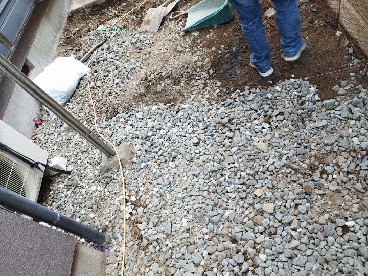 土を掘削して砕石層を作って転圧していきます。砕石層10センチ、コンクリート厚10センチを目安に施工していきます。
