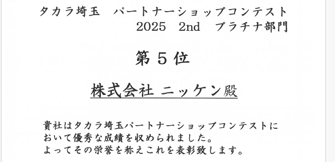 今回は、受賞のお知らせです。タカラスタンダード様より、「タカラパートナーショップコンテストプラチナ部門」 (埼玉支店内)で「第5位」をいただきました!ありがとうございます。今後も皆様のご期待に応え、お客様に寄り添えるよう日々努力していく所存です。