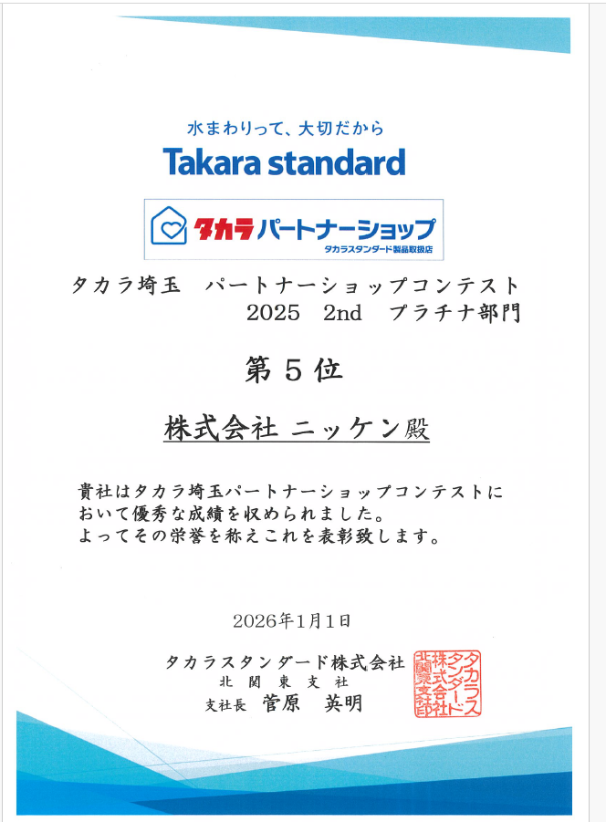 今回は、受賞のお知らせです。タカラスタンダード様より、「タカラパートナーショップコンテストプラチナ部門」 (埼玉支店内)で「第5位」をいただきました!ありがとうございます。今後も皆様のご期待に応え、お客様に寄り添えるよう日々努力していく所存です。